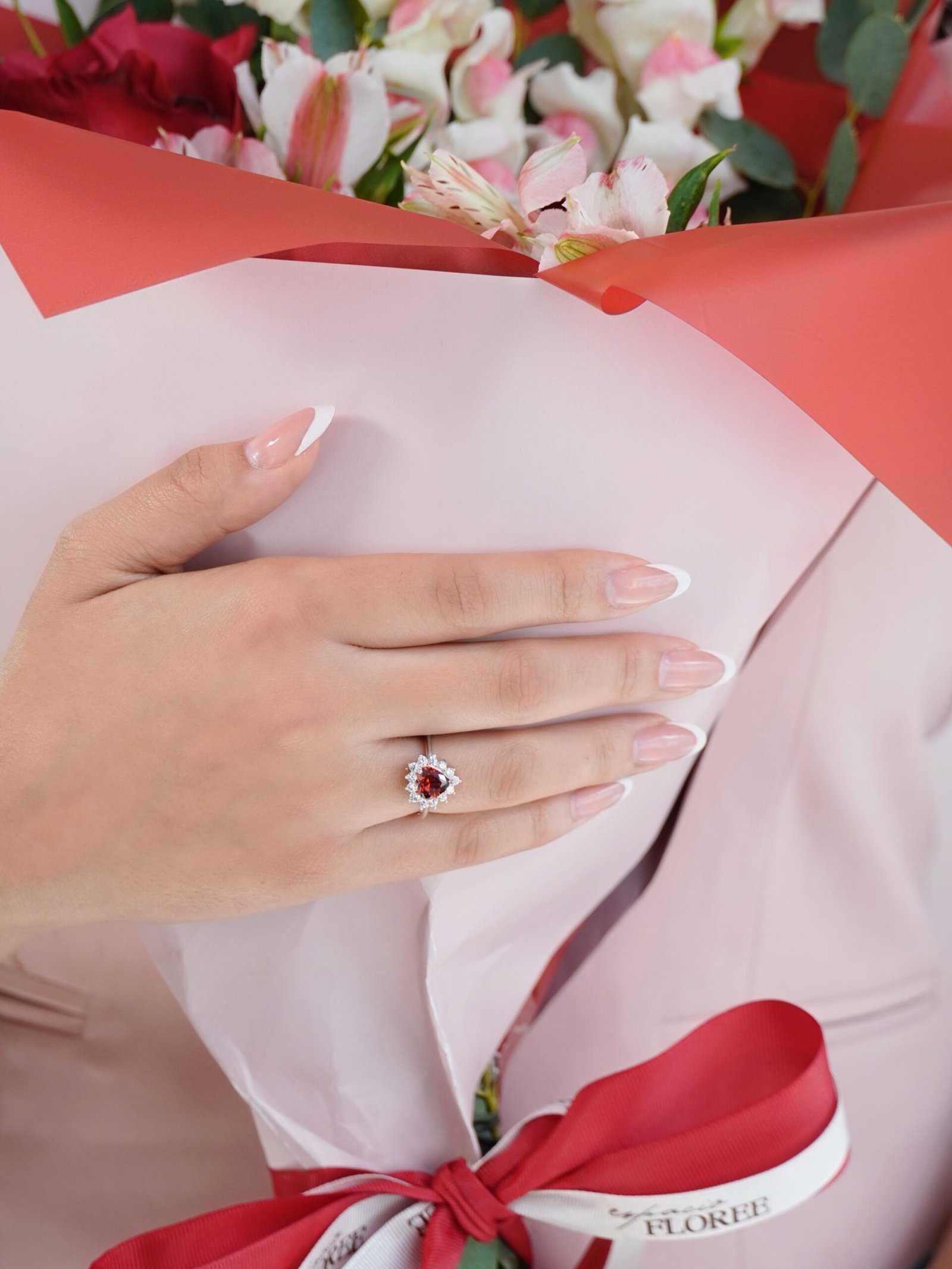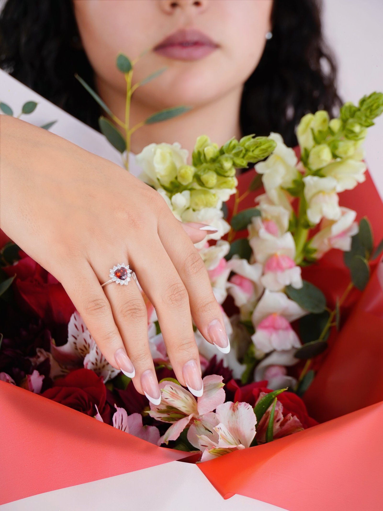 El bouquet se acompaña de un anillo de promesa de plata 925 con zirconias premium, símbolo de compromiso, cariño y conexión.